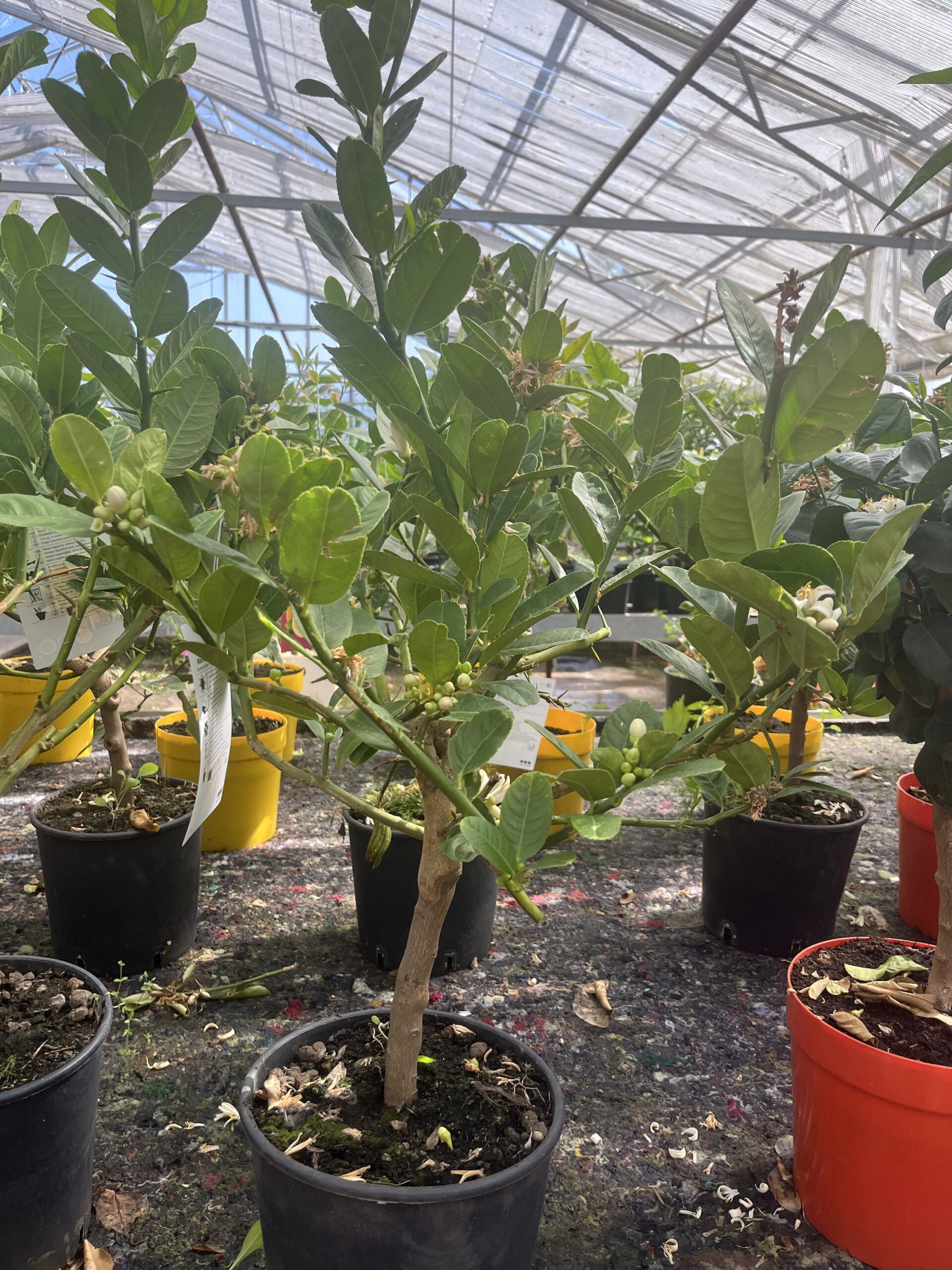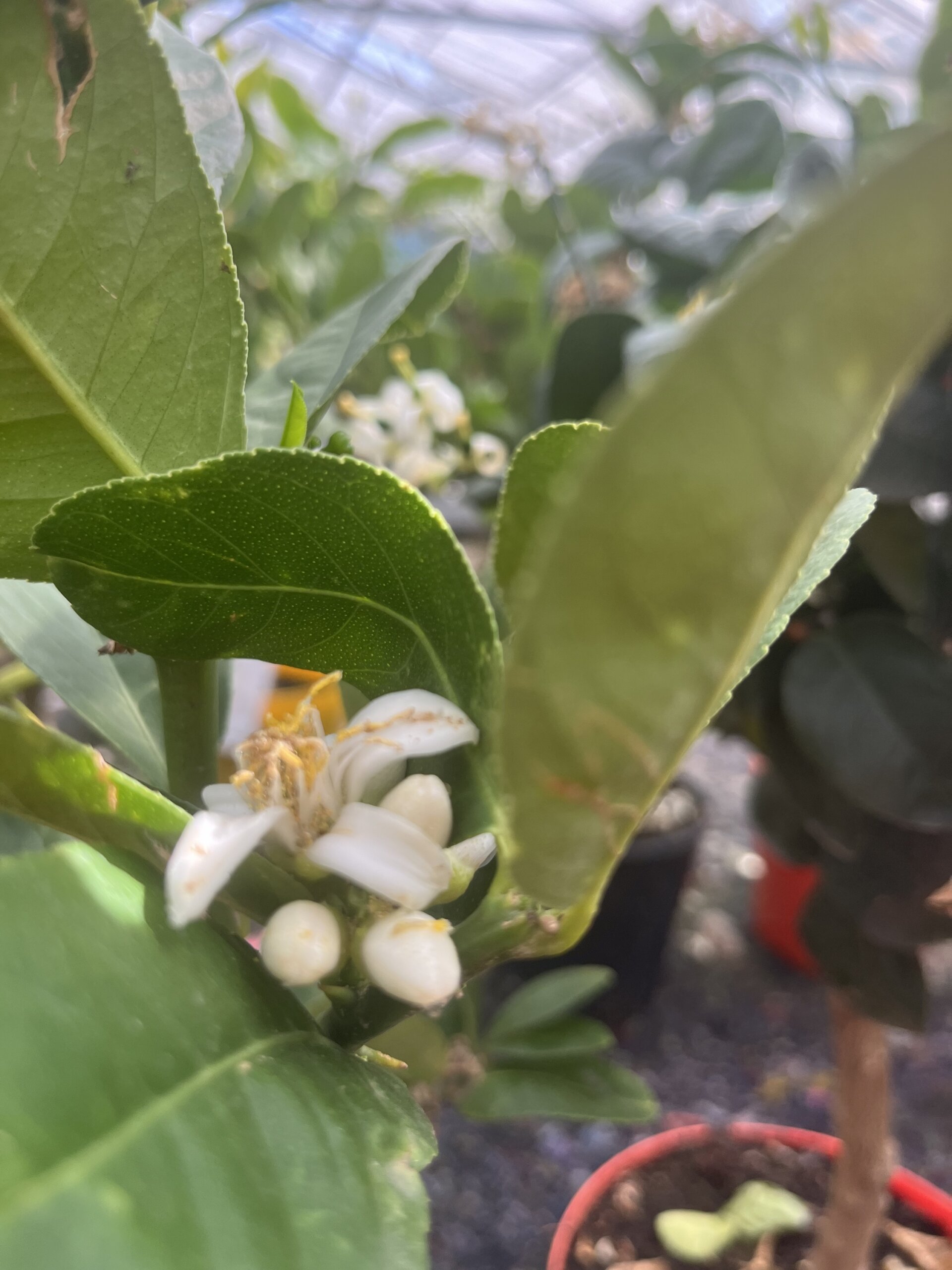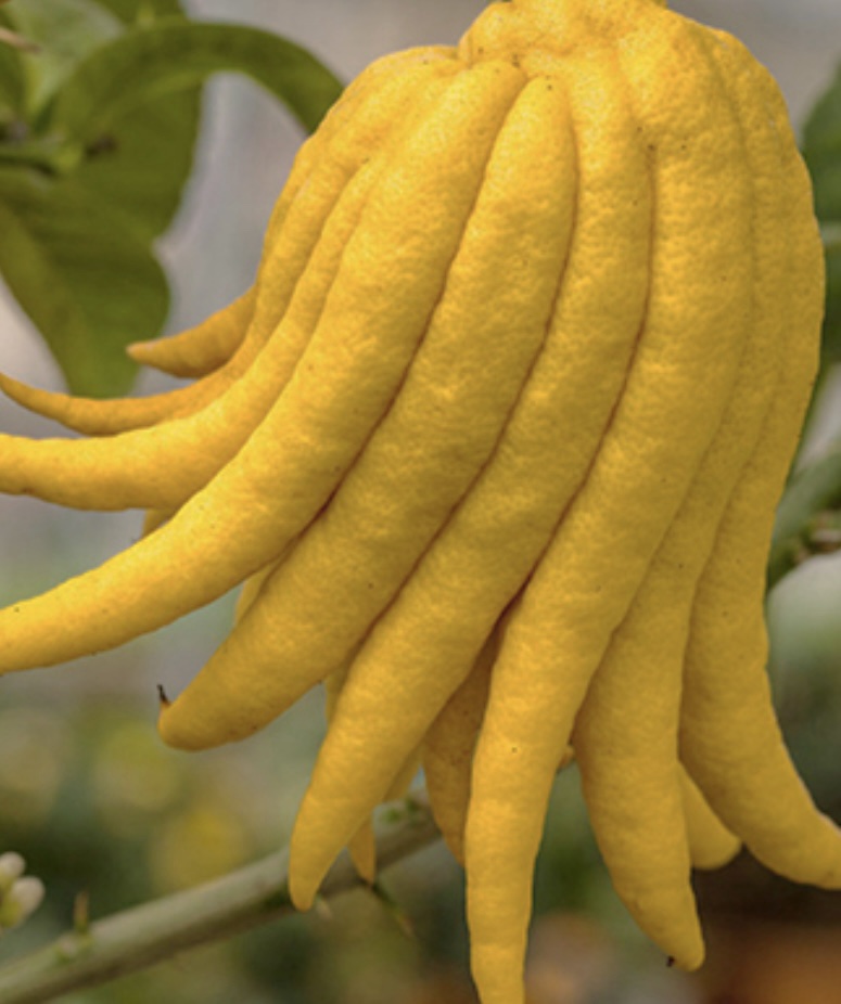 Lite rolig citrusträd med sina speciella frukter, och underbara vita blommor.